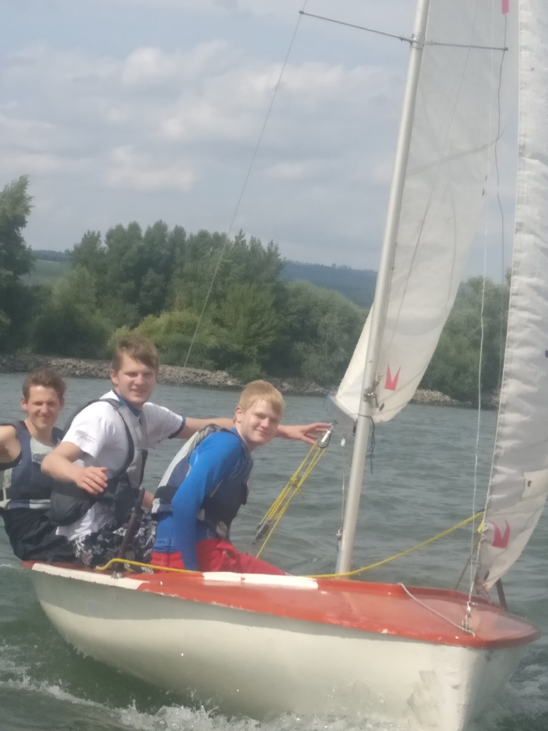 Wegen des vermehrt vorkommenden starken Windes konnte samstags auch auf dem Rhein gesegelt werden. Da war geplant um 17Uhr den Spaß zu beenden. Nein, da meint die Jugend "Wir segeln noch ne Runde" und kam eine Stunde später wieder zurück.